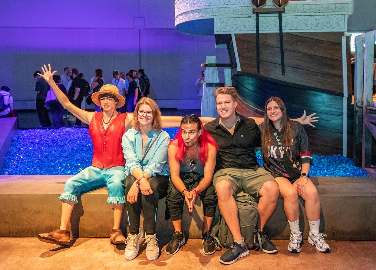 8月20日,在德国科隆,人们在2025年科隆国际游戏展上与模型合影。新华社记者 张帆 摄