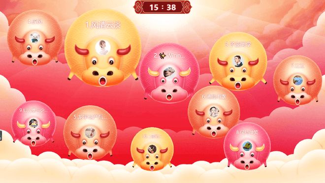跟左右点击脚印不一样,这个类别是不断点击手机固定区域即可。每点击一次,分数就会增加,对应的是牛年的专属游戏之一——好运狂犇。参与互动的用户操控福牛在大屏幕上像泡泡一样不断地相互碰撞,排名越前的用户泡泡越大,好运越旺;屏幕展示效果蠢萌,非常有特色。